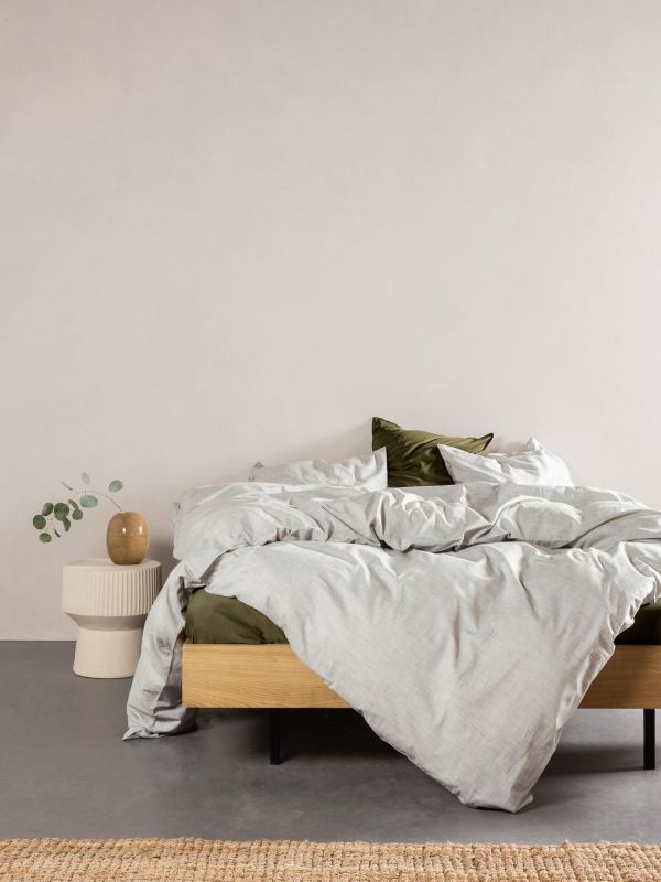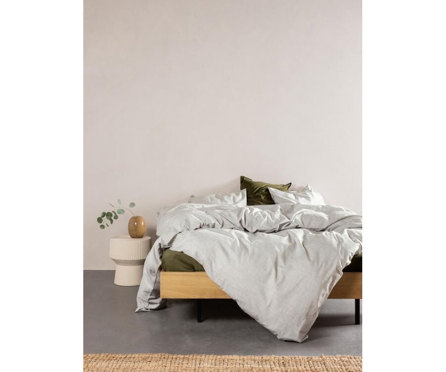 Omarm de nacht met dekbedovertrek Jule. Jule Moss heeft haar verfijnde en stoere uitstraling te danken aan haar rustgevende kleur en unieke textuur. Het dekbedovertrek is gemaakt van 100% biologisch katoen. Een speciale chambray weeftechniek zorgt voor subtiele, effen uitstraling. Bij deze techniek worden gekleurde en ongekleurde garens gecombineerd. Dit zorgt voor een natuurlijk, licht gemêleerd effect dat een prachtige diepte toevoegt aan de effen kleur. Perfect voor een moderne slaapkamer die graag rust en eenvoud uitstraalt.