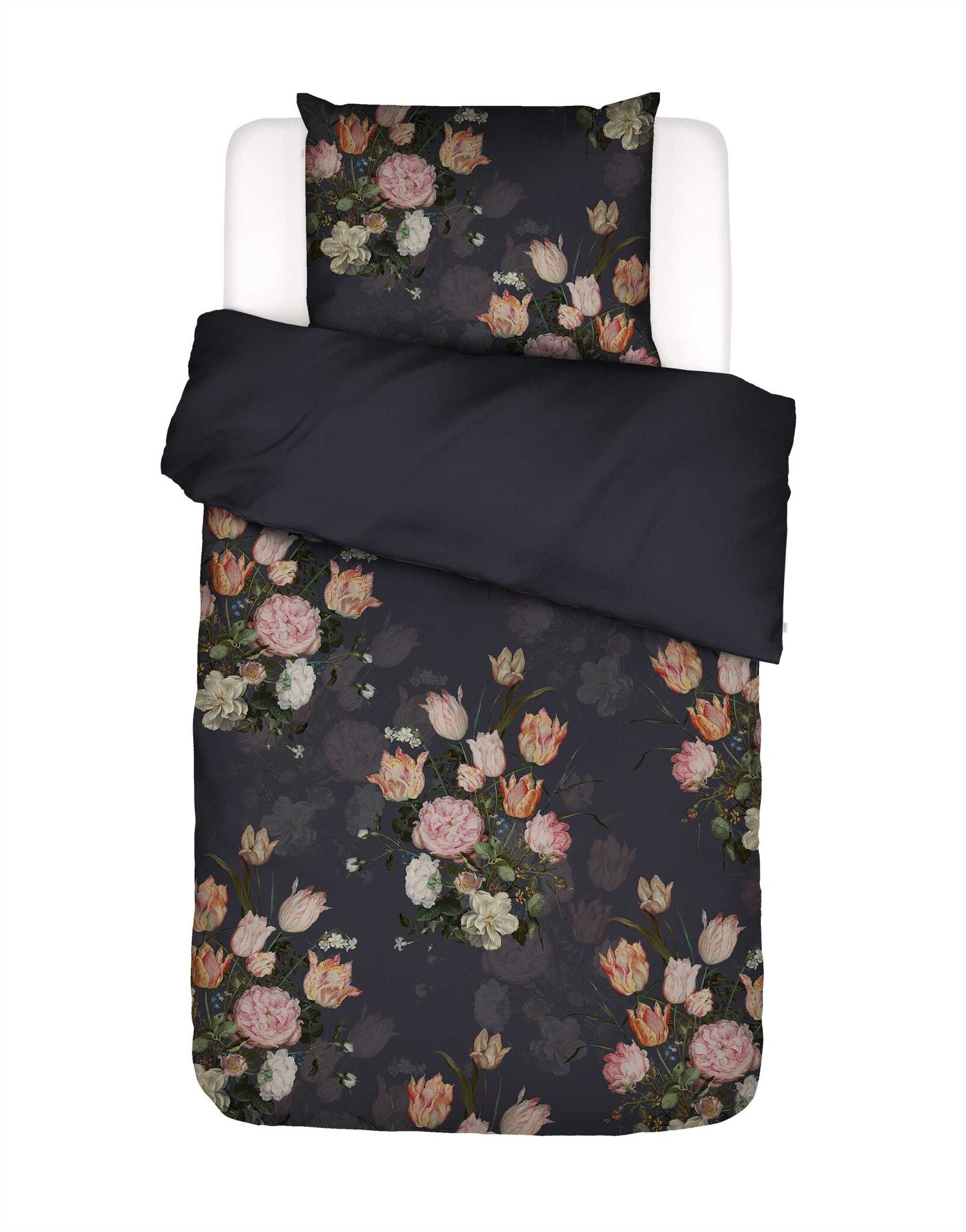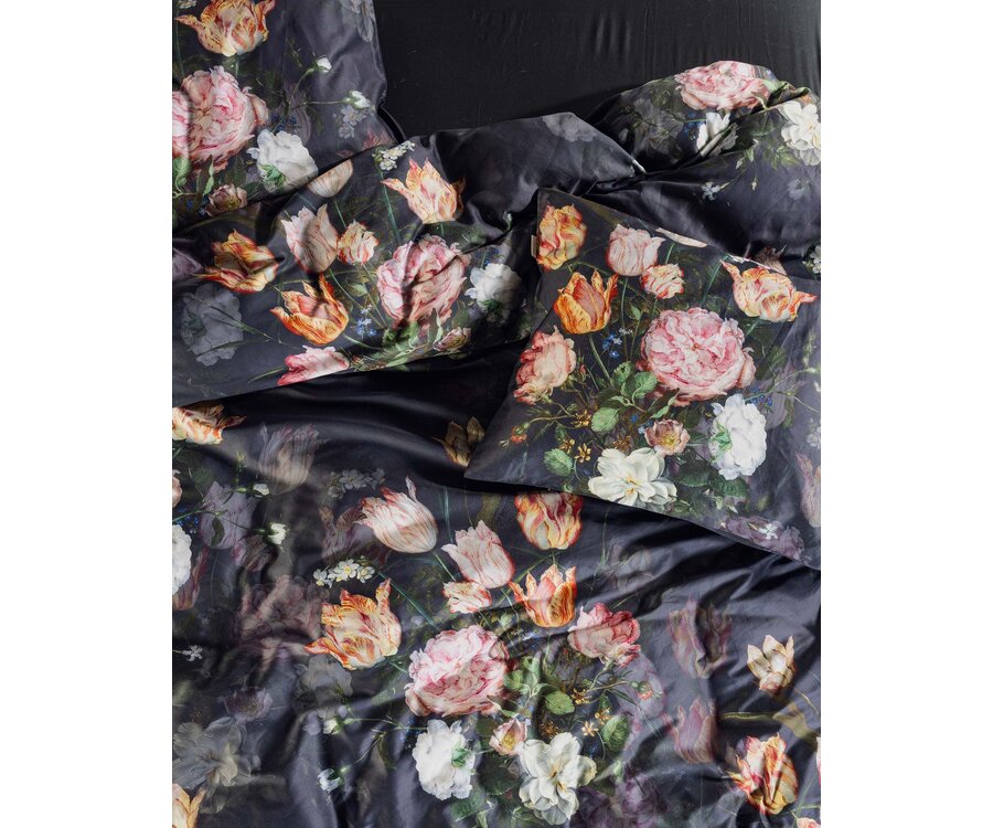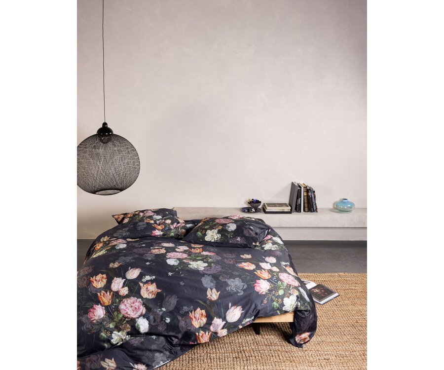 Dit Essenza dekbedovertrek Tulip Bloom toont een klassiek bloemstilleven op een diepe, nachtblauwe achtergrond. Het rijk gedetailleerde boeket van oudroze, perzikkleurige en crèmekleurige tulpen is geïnspireerd op de Wan-Li-vaas met bloemen van Jan Brueghel de Oude. Het originele schilderij hangt in het Mauritshuis en komt op stof prachtig tot leven.