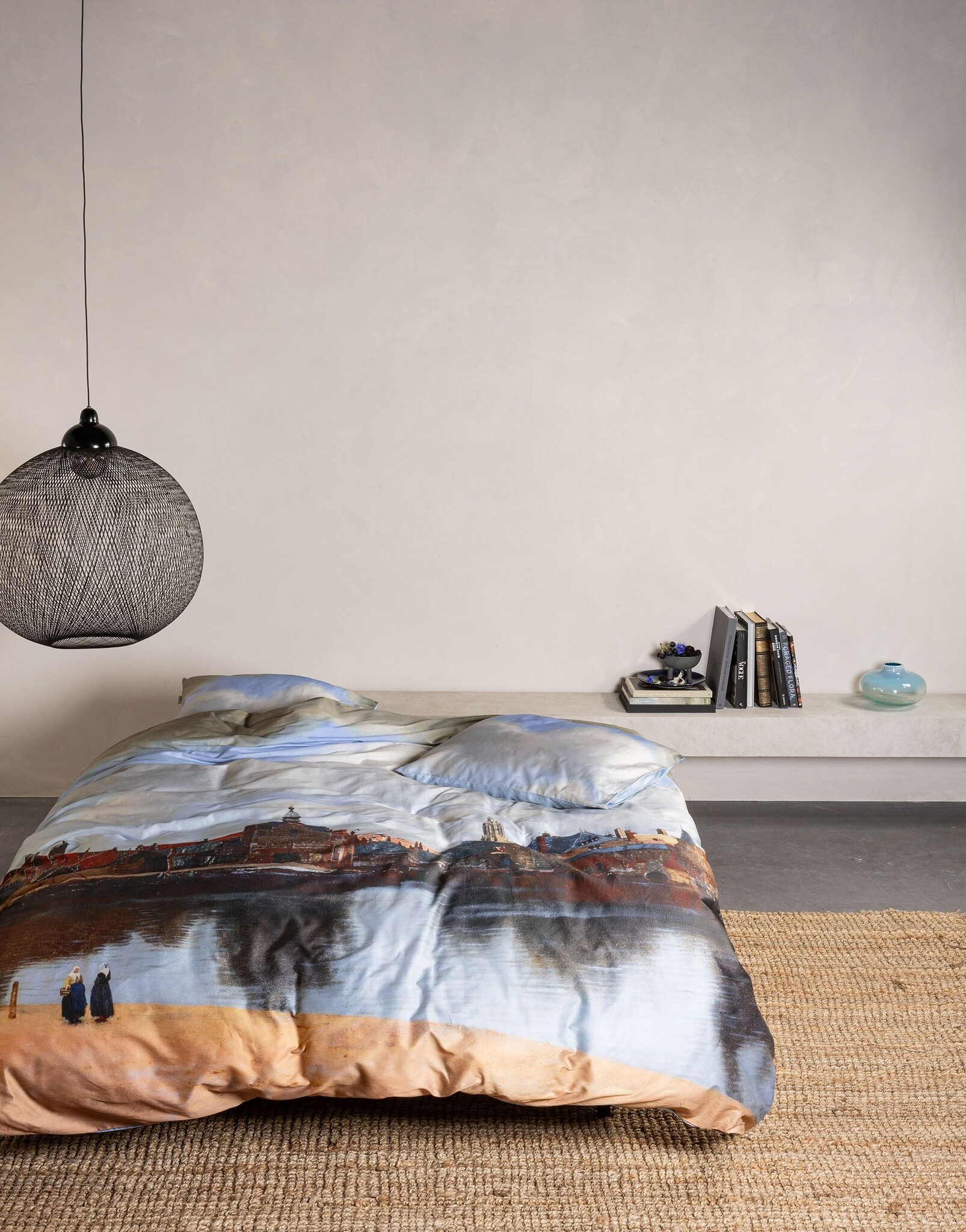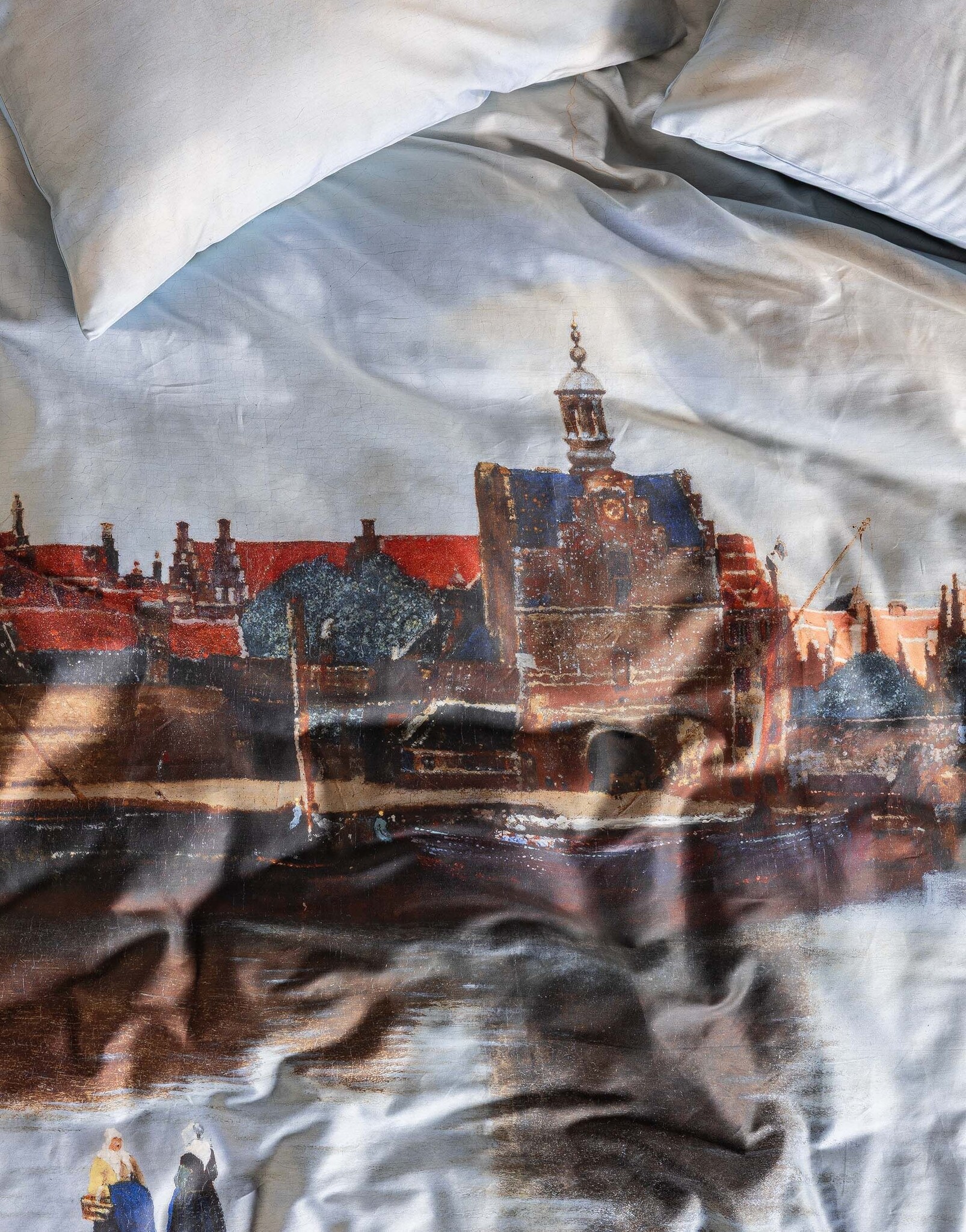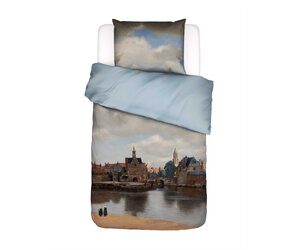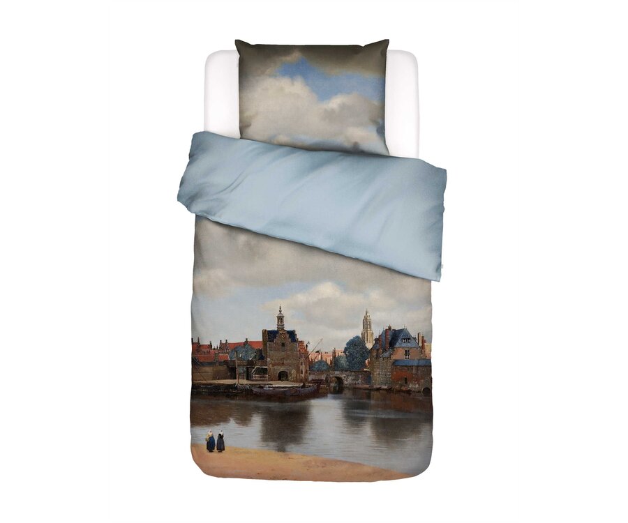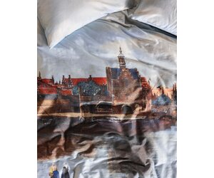 Dit Essenza dekbedovertrek View on Delft brengt een meesterwerk van Johannes Vermeer naar je slaapkamer. Het wereldberoemde schilderij Gezicht op Delft, te zien in het Mauritshuis, is natuurgetrouw vertaald naar textiel. De zachte, grijzige blauwtint geeft de print een kalme, tijdloze uitstraling die uitnodigt tot verstilling.