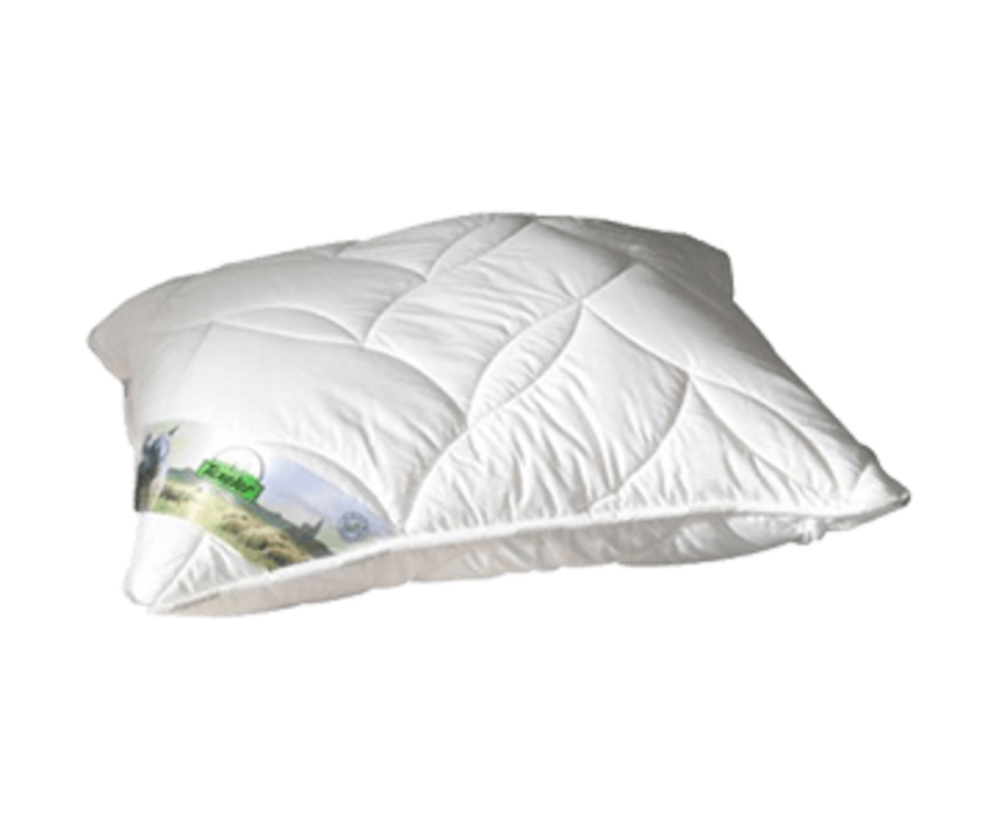 Een weldadig hoofdkussen met neksteun en een doorgestikte edelsatijnen tijk met een wolvlies van 125 gr/m2. Het kussen zelf is gevuld met zachte, scheerwollen bolletjes.
